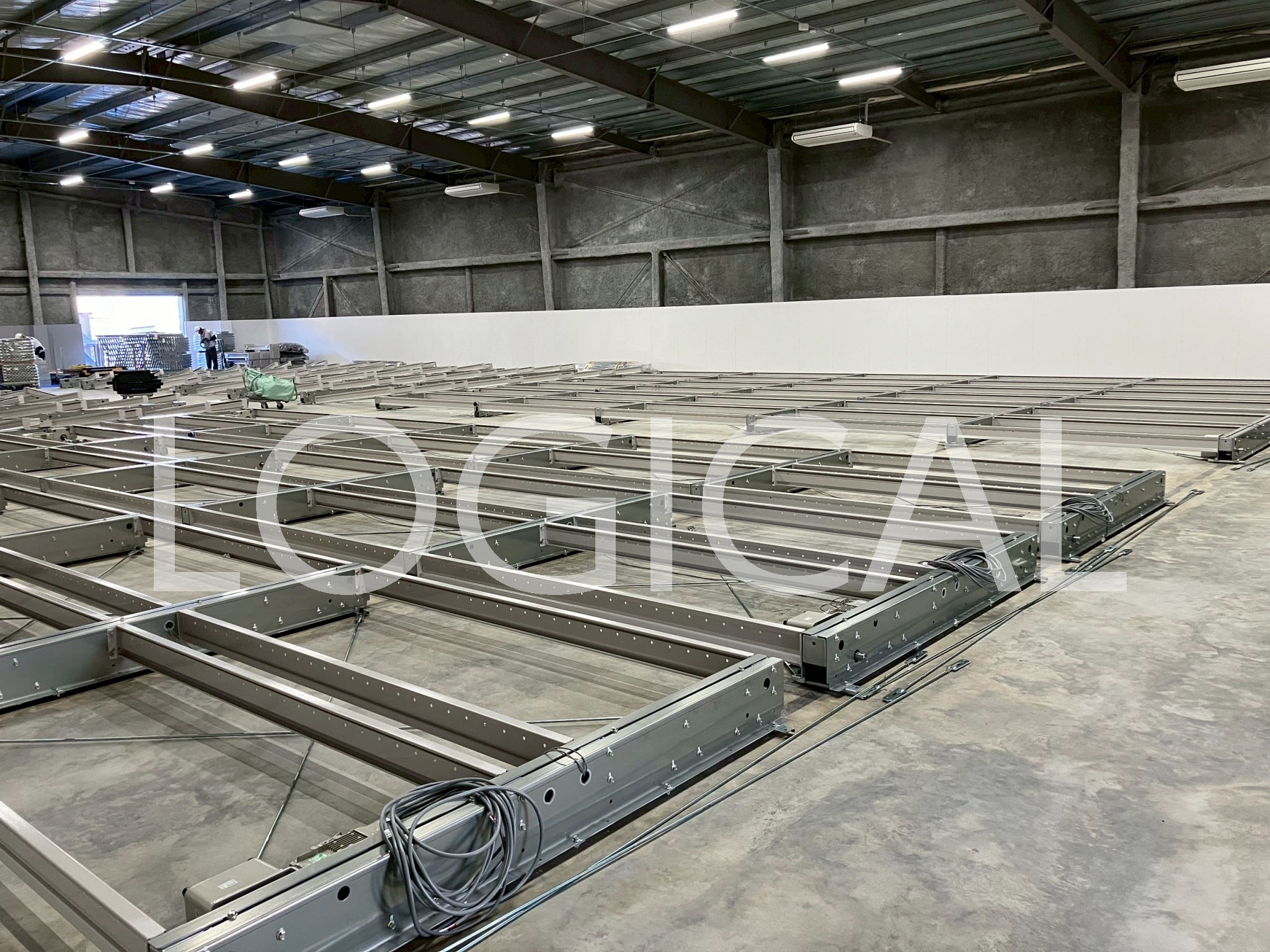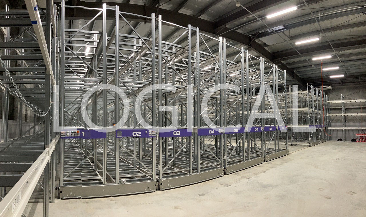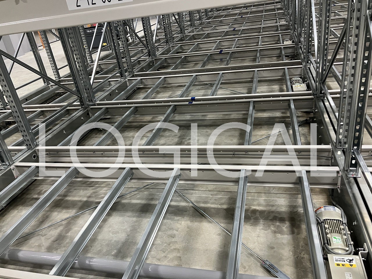 半導体材料の保管量が今後大幅に増える見込みのため、倉庫の保管効率を最大化する目的で電動移動パレットラック(電パレ・レール式)を導入しました。