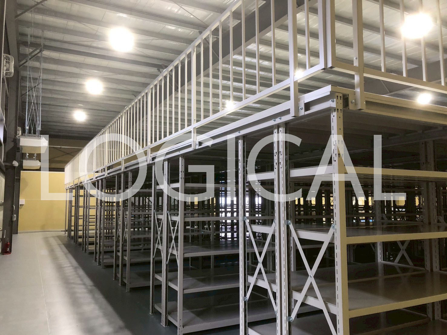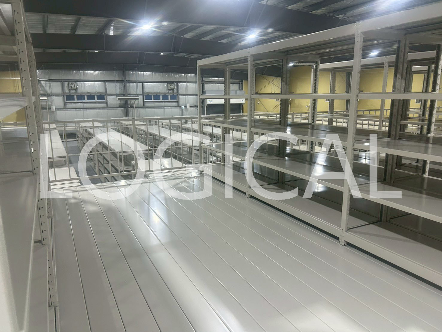 通常の中量ラックだけでは保管量が不足するため、一部のラック上にフロア材を敷き詰めて2層構造の積層ラックを構築。